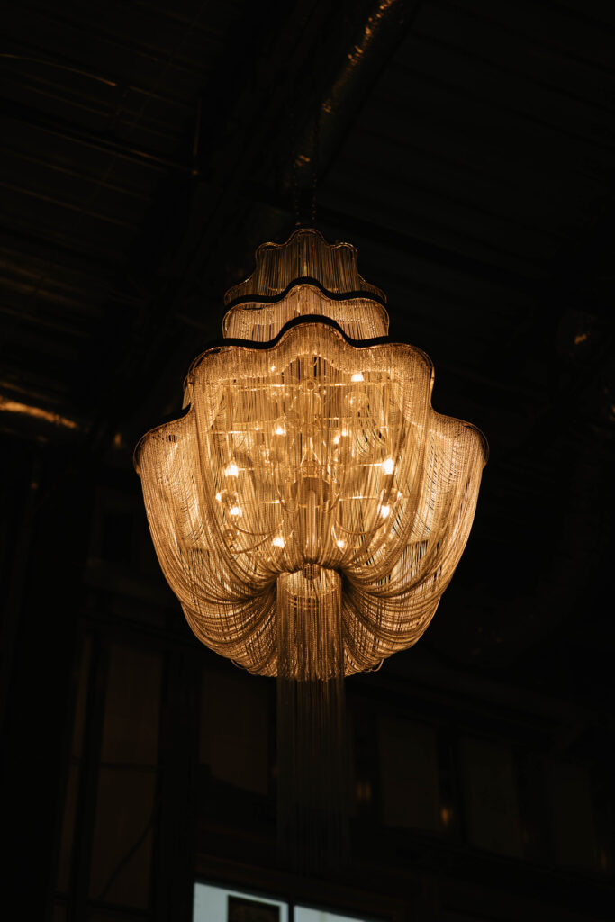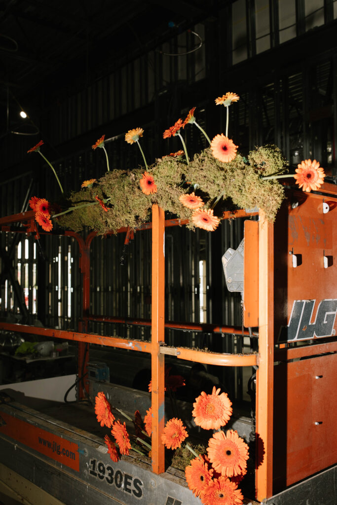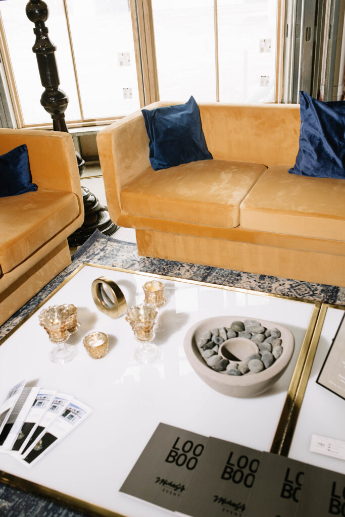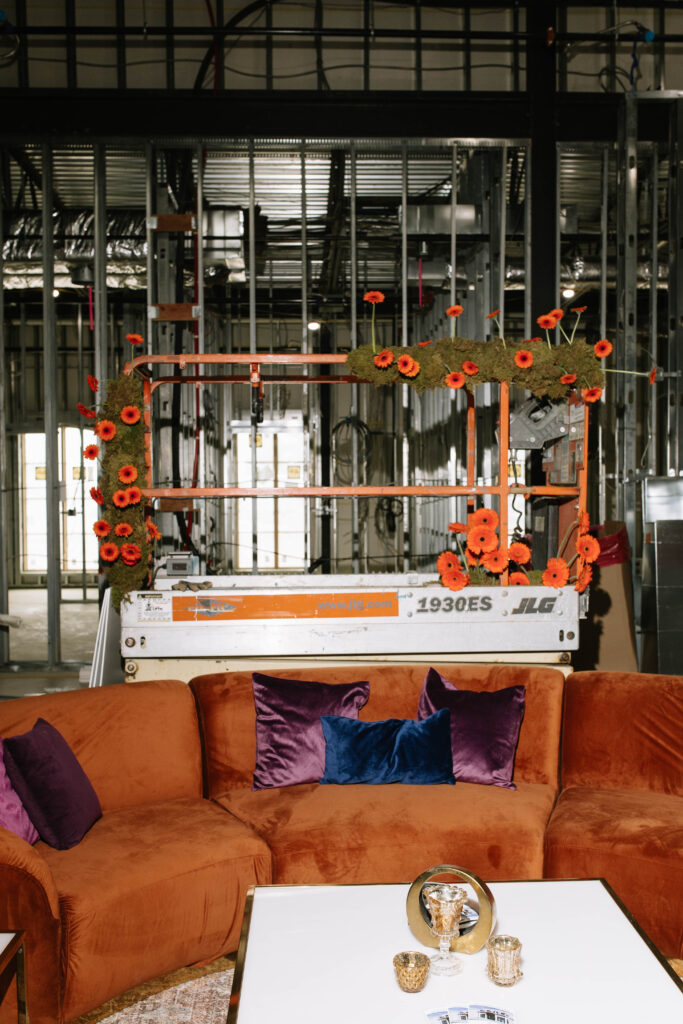 The Reception Hall at Westwood was in a fabulously unique design state for the party: our segmented arch designs are visible above the (massive) main bar. We took advantage of the various construction equipment and embraced the look: florals rigged on a lift made a backdrop to one of our lounges. We displayed artwork in unfinished walls. MichaelAngelo’s Events truly showed off with some of the most beautifully unique rentals: burnt orange and blush pink lounge furnishings, with a clean, slightly retro style elevated the space with an instantly cozy and cool look. Other favorite rental selects? a gorgeous chandelier, and stunning bars to match the lounges. If you’re planning to host a tented wedding at Westwood, or love the feel of a curated lounge space or photo area for your wedding day, we highly recommend perusing the offerings from this talented Westwood Preferred Vendor.