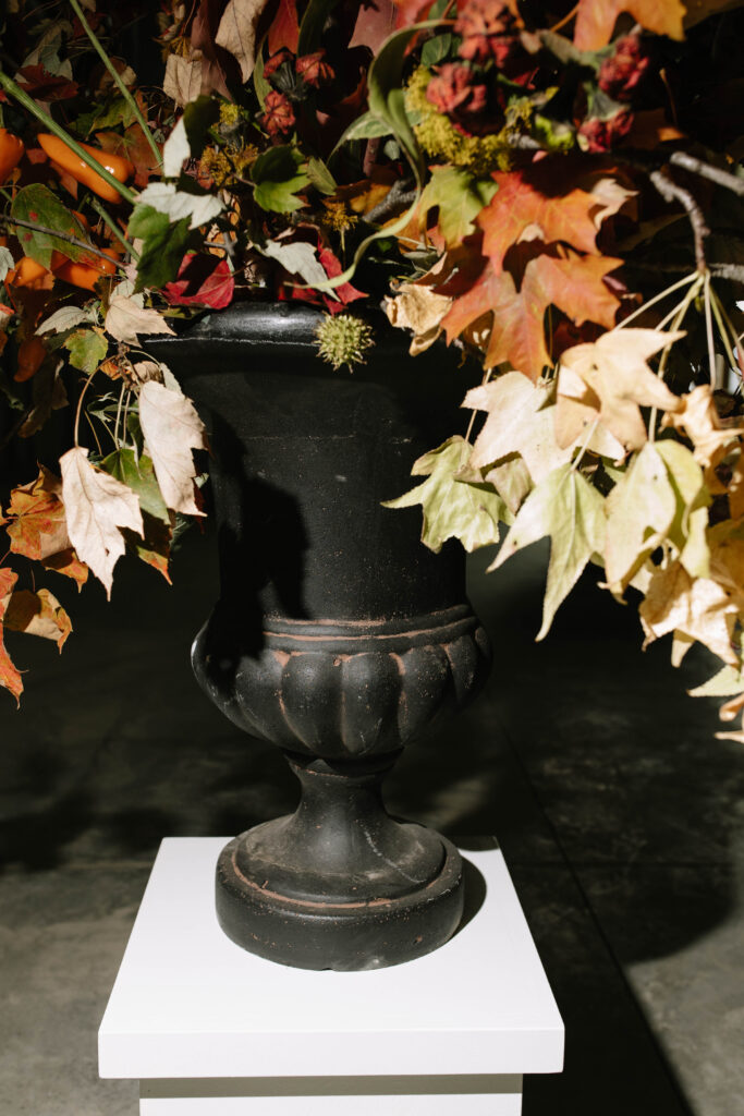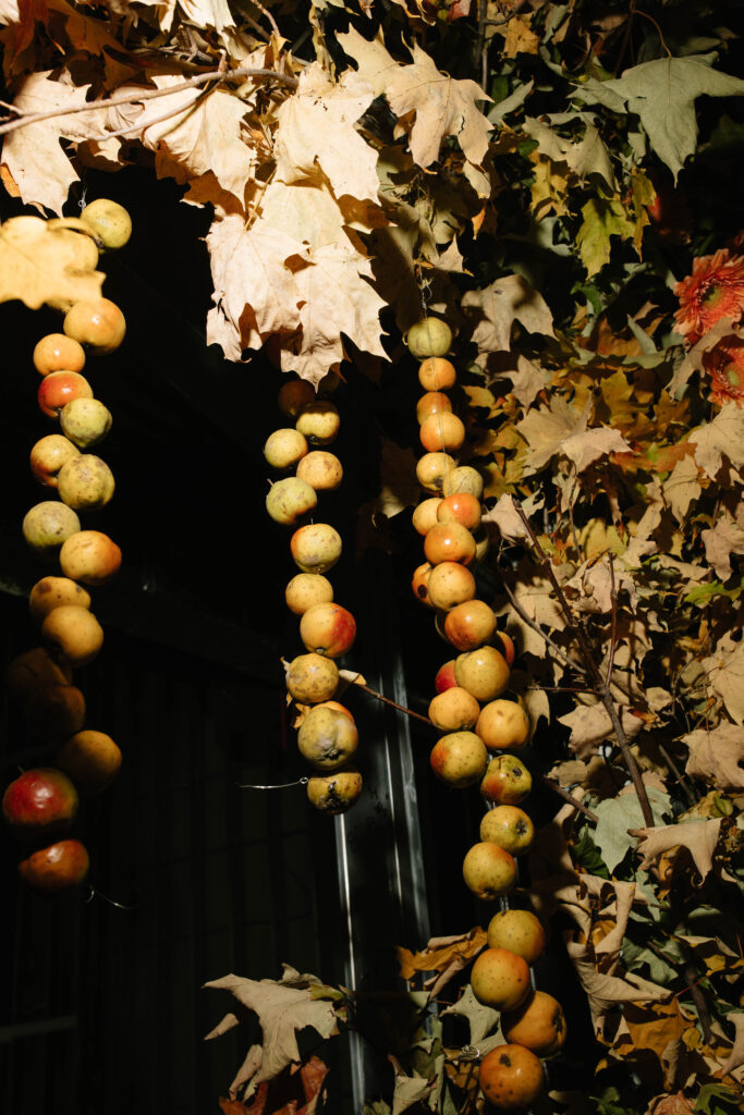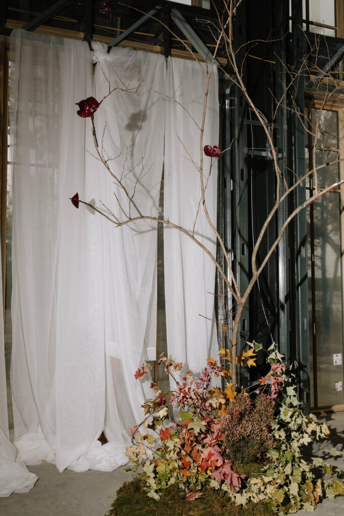 What’s an event without gorgeous florals? Renaissance Flower blew us away with delightfully creative and dreamily playful designs: an entryway featuring rigged fall fruits and tonal autumn branches and blooms. On the Vowery stage, fall trees in front of drapery made for the perfect photo spot.