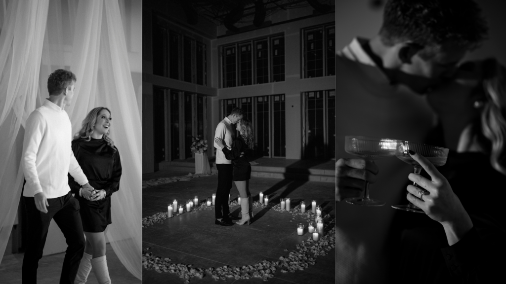 With that evening in mind, Tyler began working closely with the Foundations team to design a proposal that would feel like a natural extension of their story. Shelby Vance, Lead Planner, recalled how intentional Tyler was throughout the process, sharing, “When Tyler approached us, he was just so excited to start seeing this special moment come to life. He put so much thought and detail into the day and was very intentional about what Lexi would like the most. The original vision was something soft and romantic, just like their relationship.” Designing within an unfinished space presented its own challenges, but it also created an opportunity to transform the environment in a way that felt both creative and meaningful.