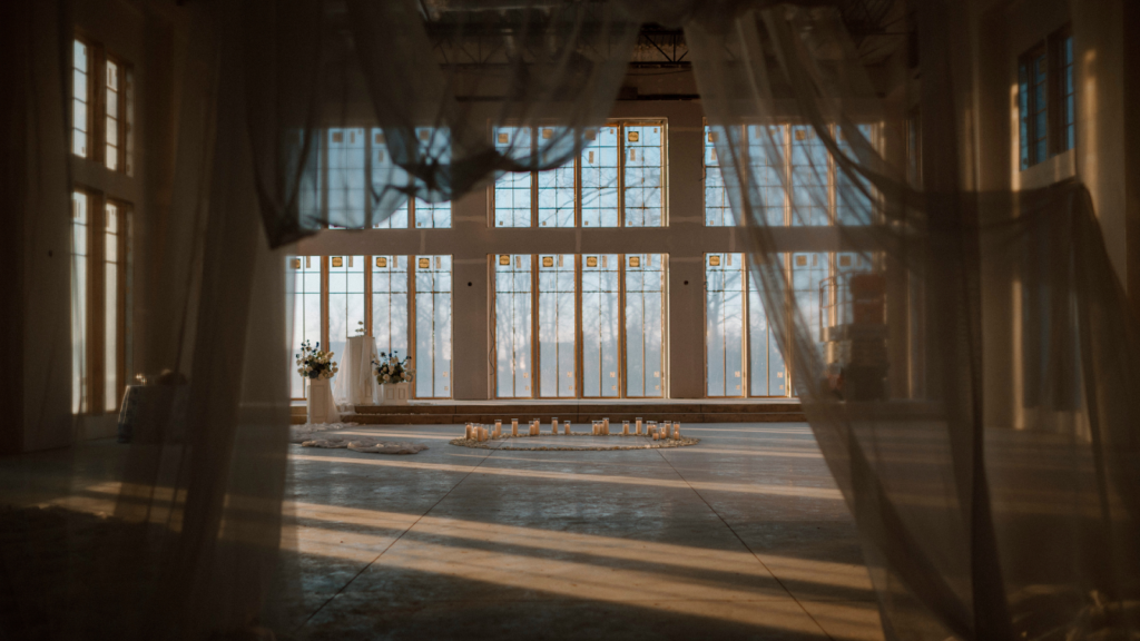 When November 22nd arrived, Lexi believed they were simply visiting the venue to see its progress. Looking back, she shared how genuine the surprise was, saying, “Our engagement was the greatest surprise and blessing of my life. Tyler did an absolutely incredible job buttoning up every detail to put together a fairytale moment for me.” She even came prepared for what she thought would be a casual tour, adding, “We laughed afterwards because I was set on bringing my little digital camera for our tour and was clearly not expecting professional photographers so wonderfully happy to capture our moment.” The realization of what was happening came gradually. “I truly didn’t know until Ty started taking my coat off and our favorite song, ‘Ordinary,’ started playing,” she said. “He swept the white curtain away to reveal the most breathtaking arrangement of flower petals, candles, hydrangeas, and a perfectly setting sun.”